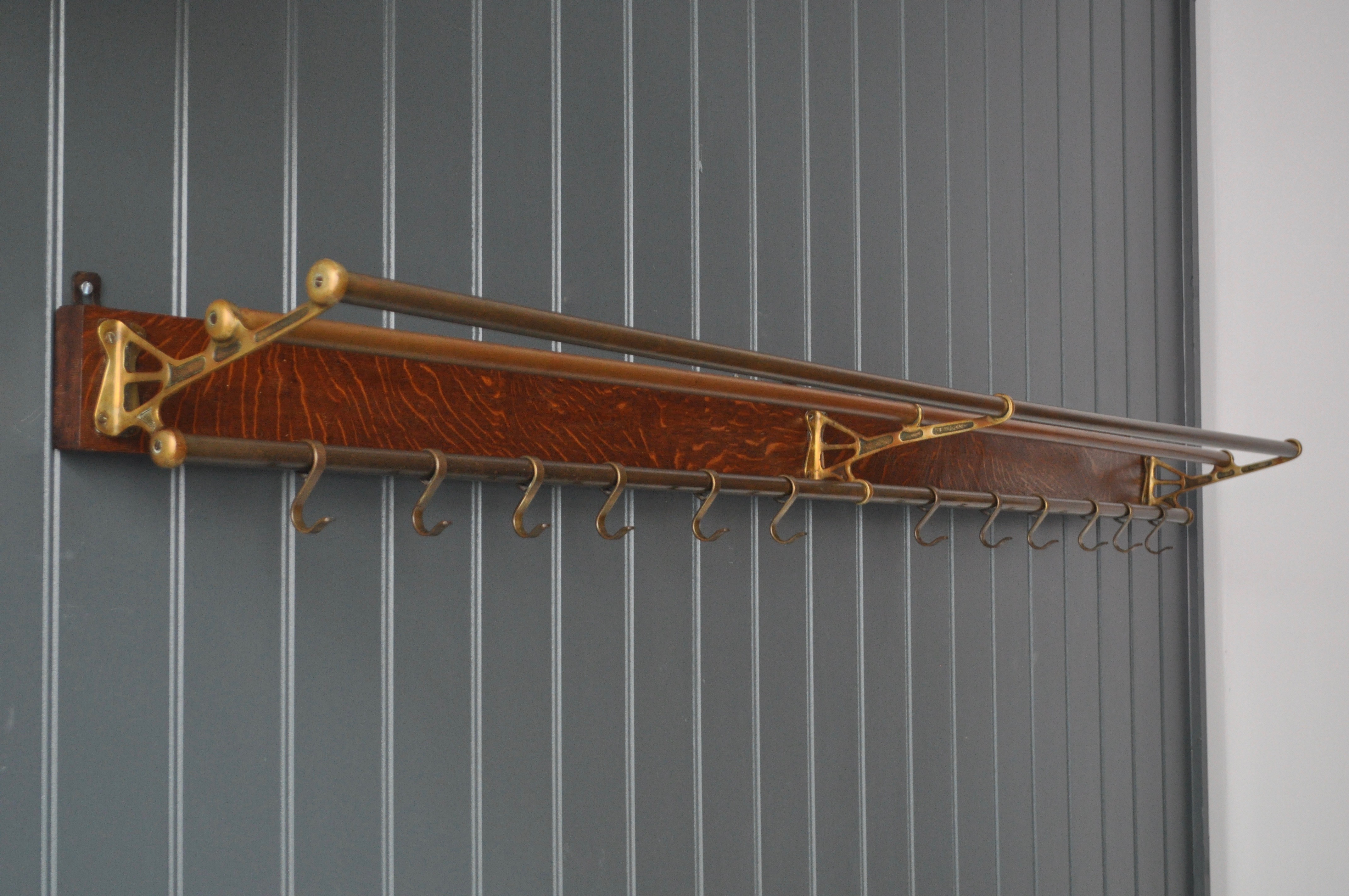 Beautiful French coat rack with 12 sliding hooks below a hat-shelf, and mounted on an original oak board with three wall brackets. Lovely colour and patination to the brass, and a really good size, perfect for a long entrance hallway.