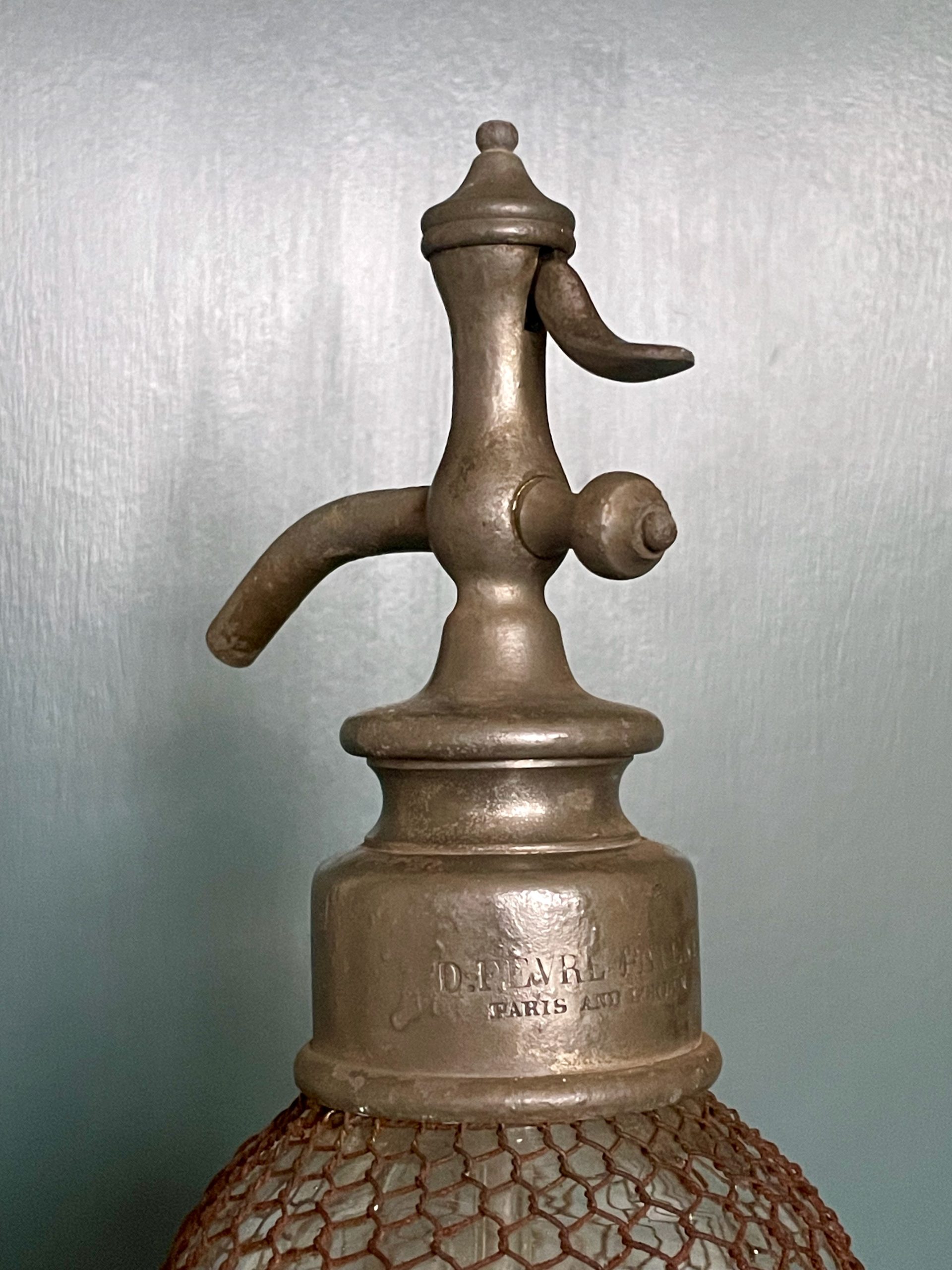 Beautiful French 19C gourd-shaped soda-syphon, in lovely condition with no knocks or chips. The maker’s stamp is there to the top – ‘D. Fevre Paris & London’. In untouched condition, with patination consistent with age.