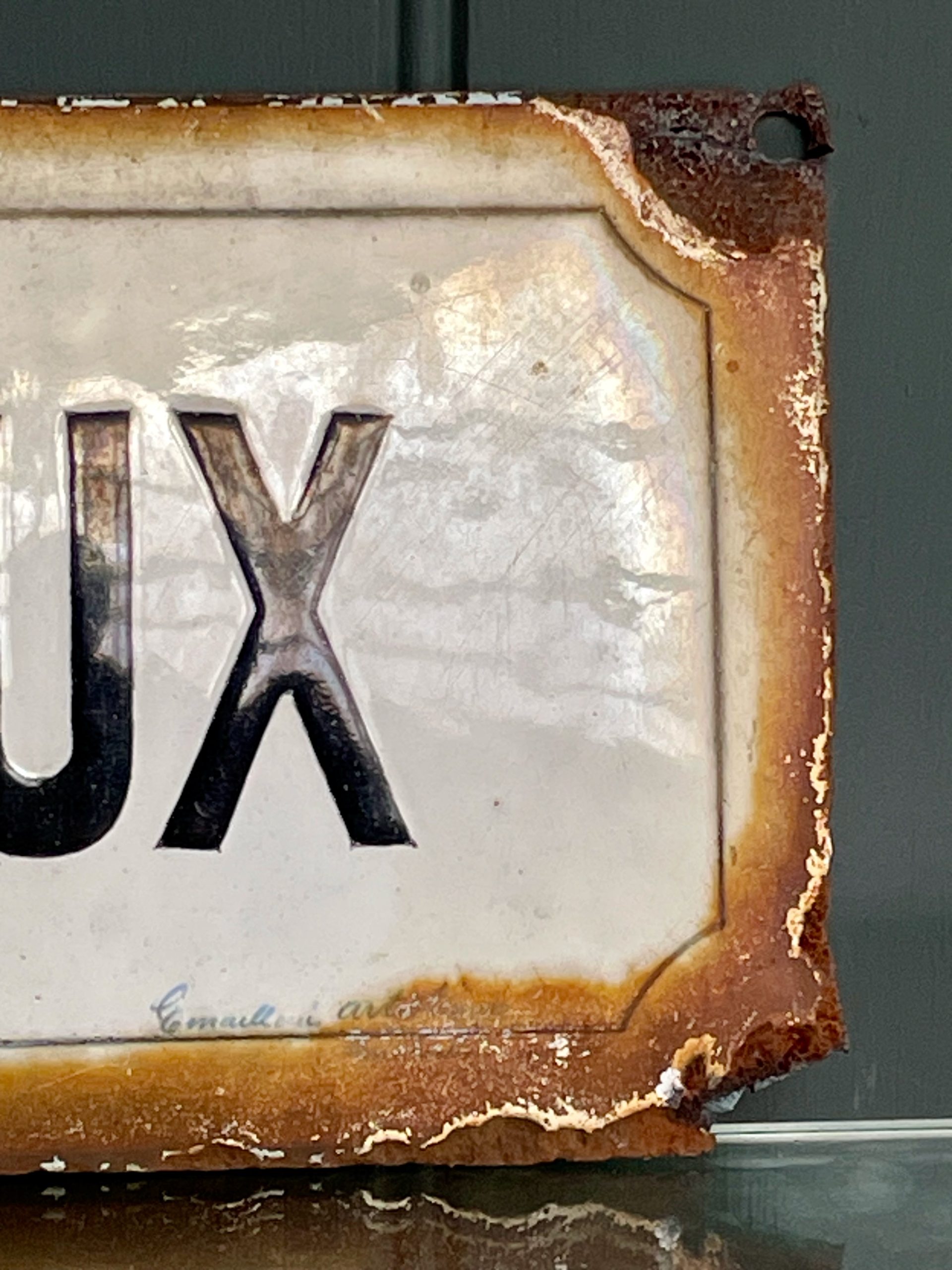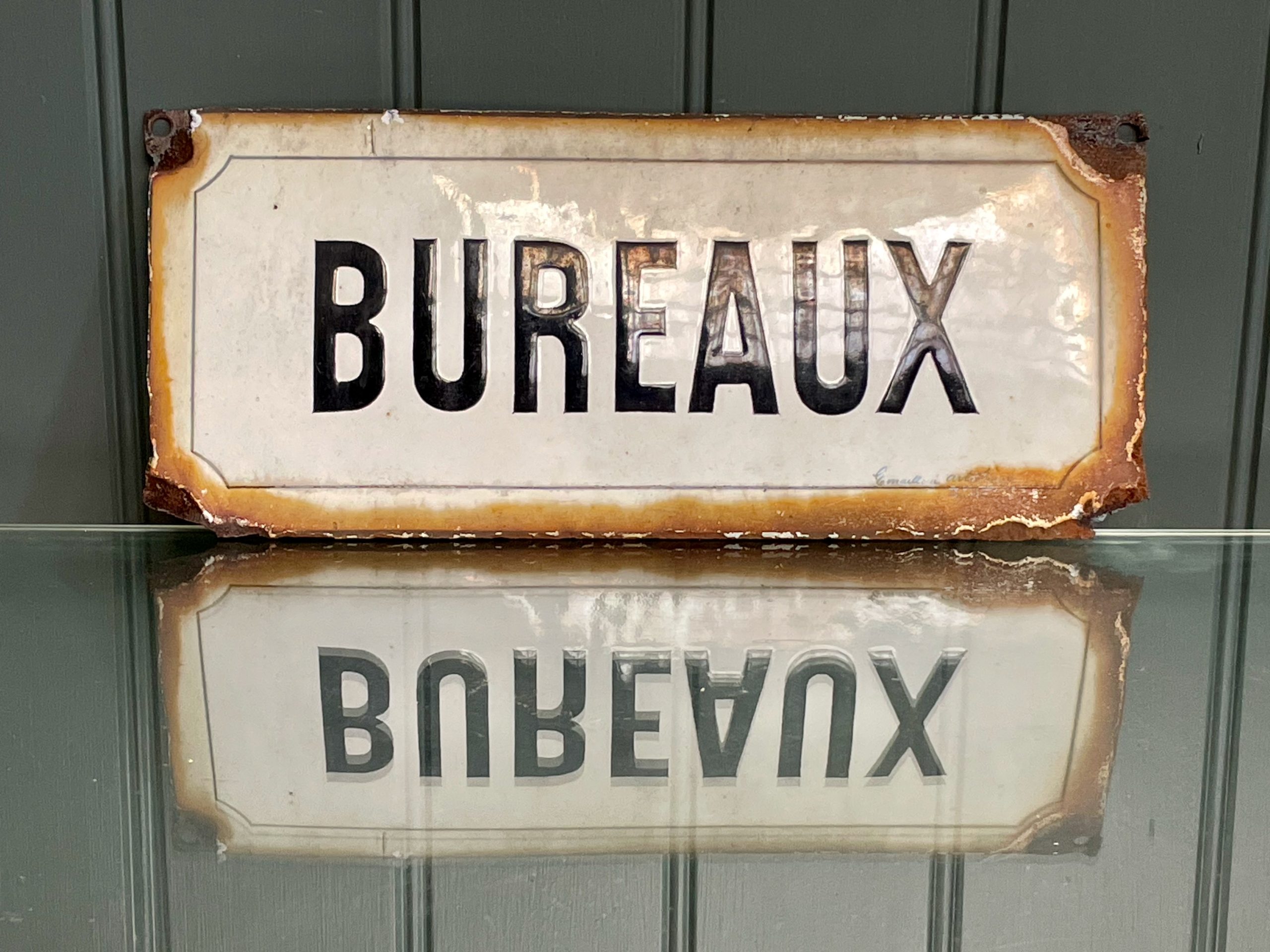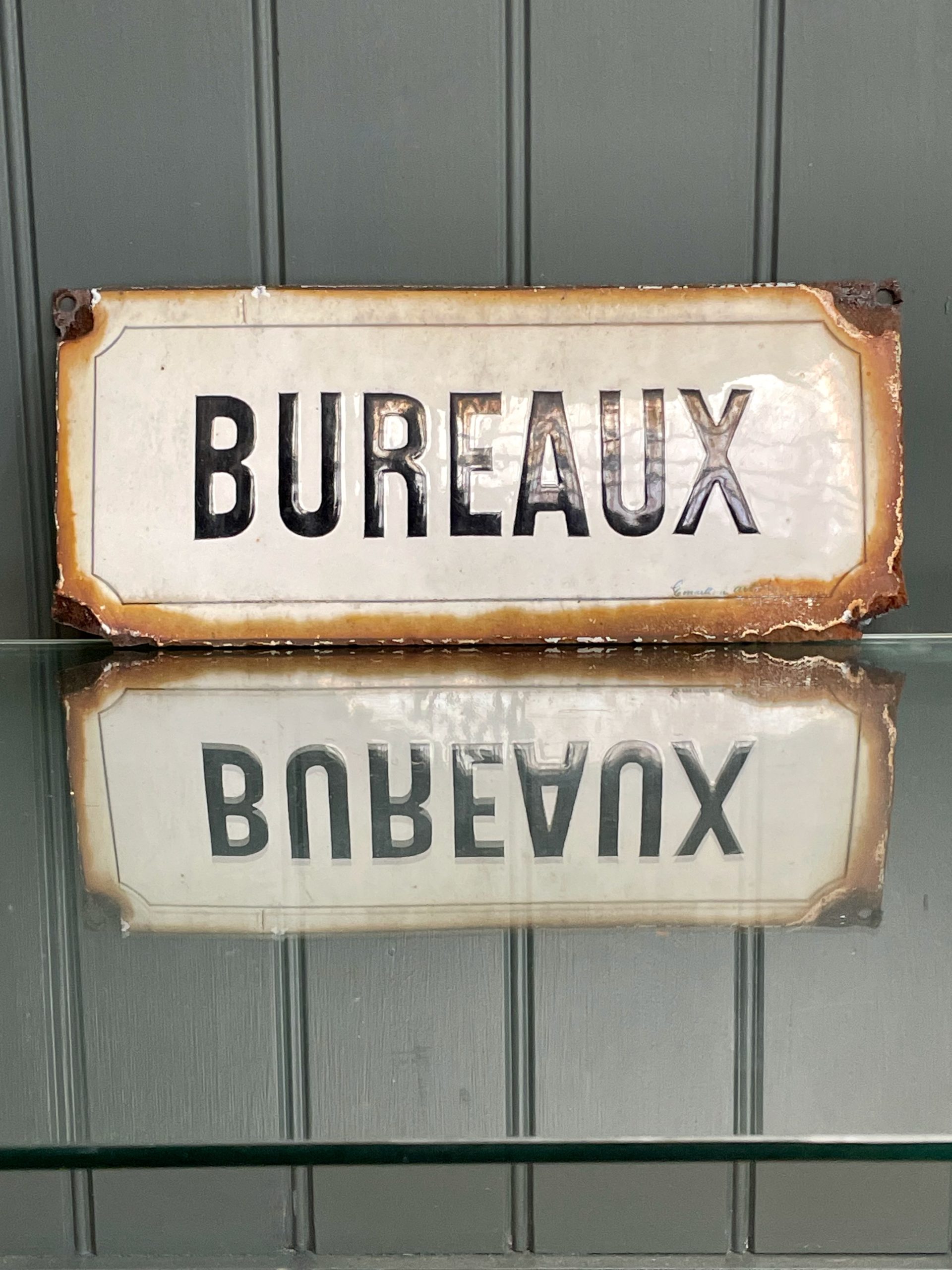 A classic French enamelled ‘offices’ sign. A lovely typeface to the word Bureaux, and a good scale. Quite a bit of loss to the outer edges, but the two holes to the top corners are still present to allow for hanging.