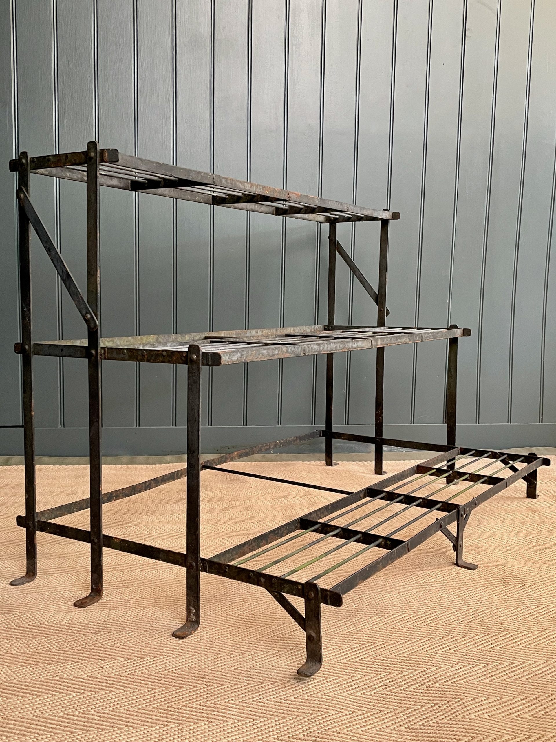 French metal florist’s stand, with three levels, and in original faded paint, with wear consistent with age. A lovely way to add height to a display of plants on a small terrace or balcony.
