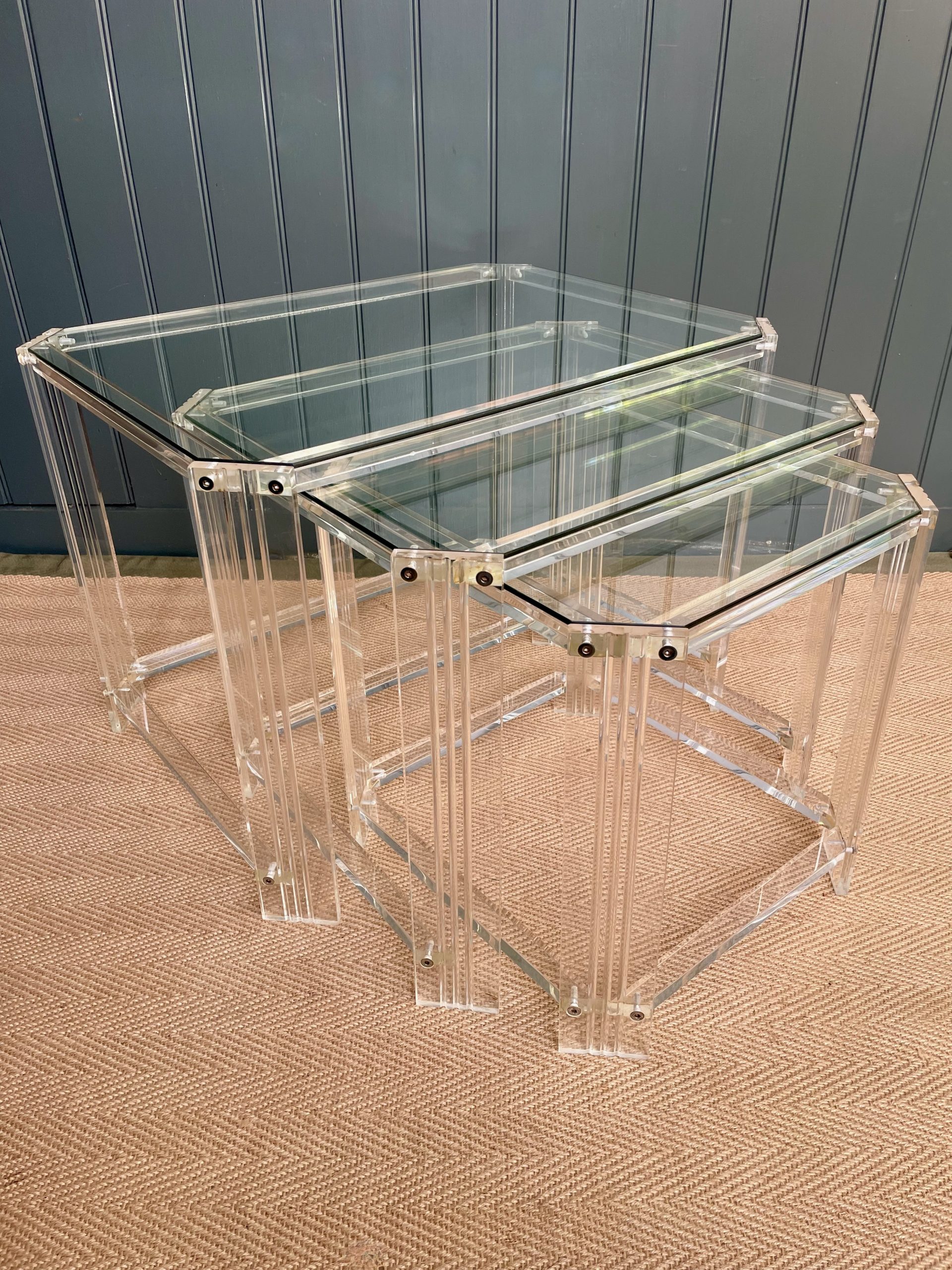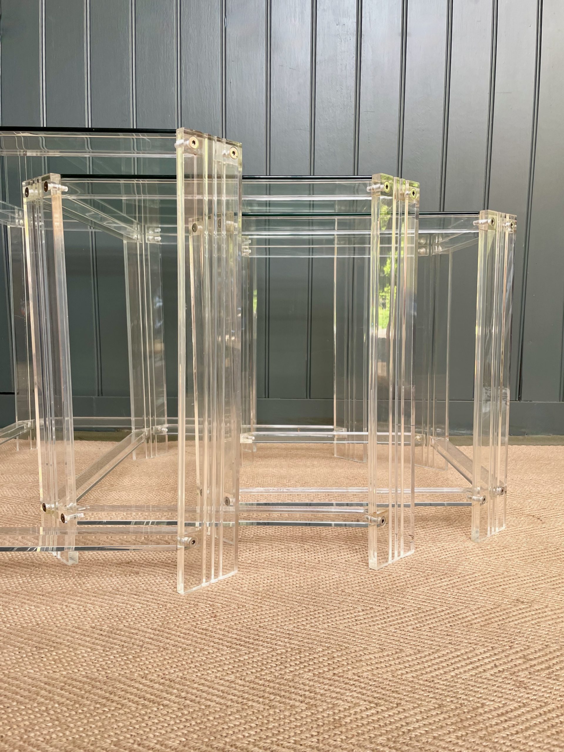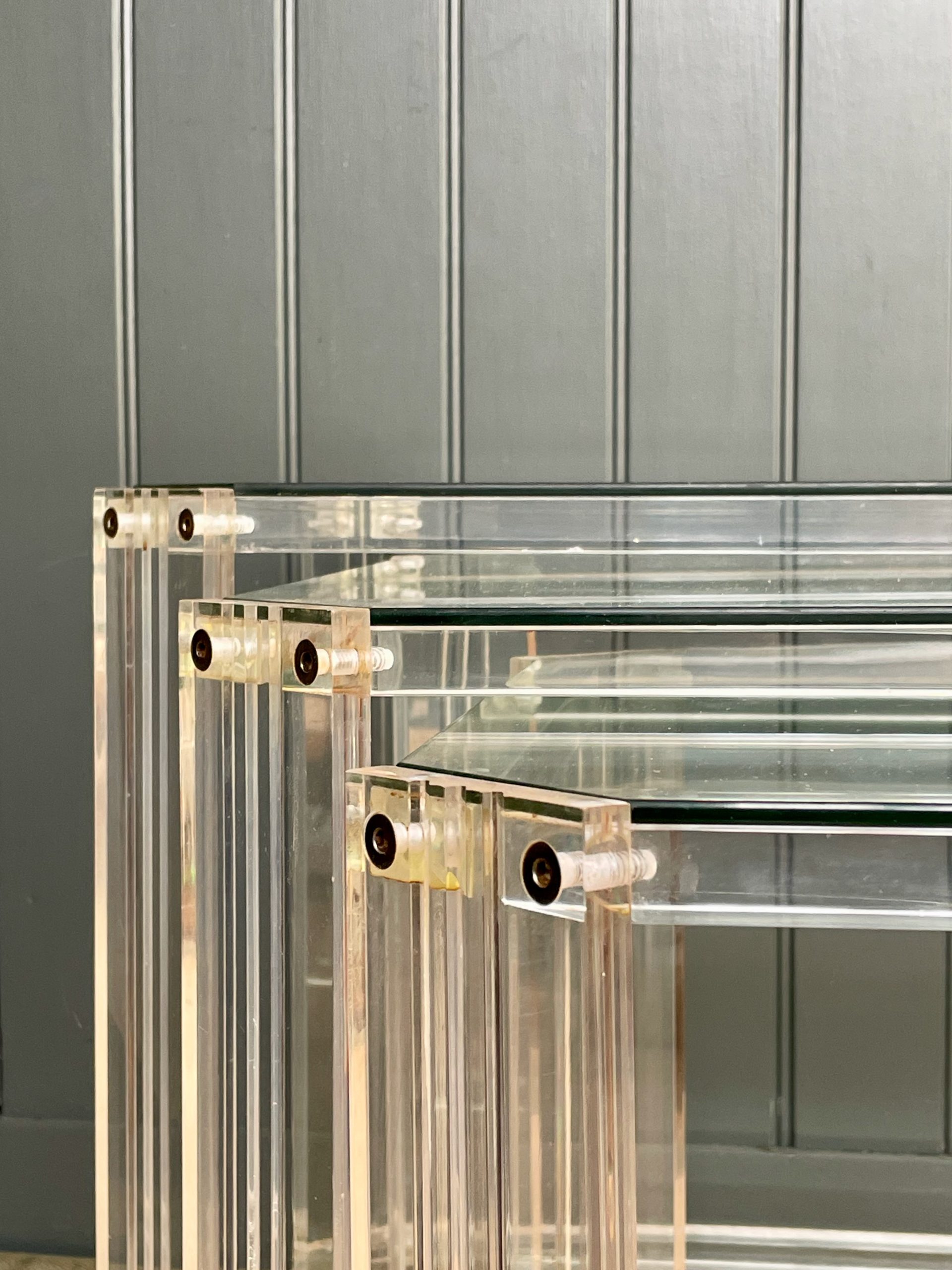 A beautiful trio of French Mid-Century lucite nesting tables, with original glass tops. A lovely design, with faceted corners, and a remarkable transparency, allowing even the thread of the screws to be revealed. Remarkably clean condition, with just the lightest of wear consistent with age. The smallest table is H: 44cm x W: 40cm x D: 43cm. Dimensions below are for the largest.