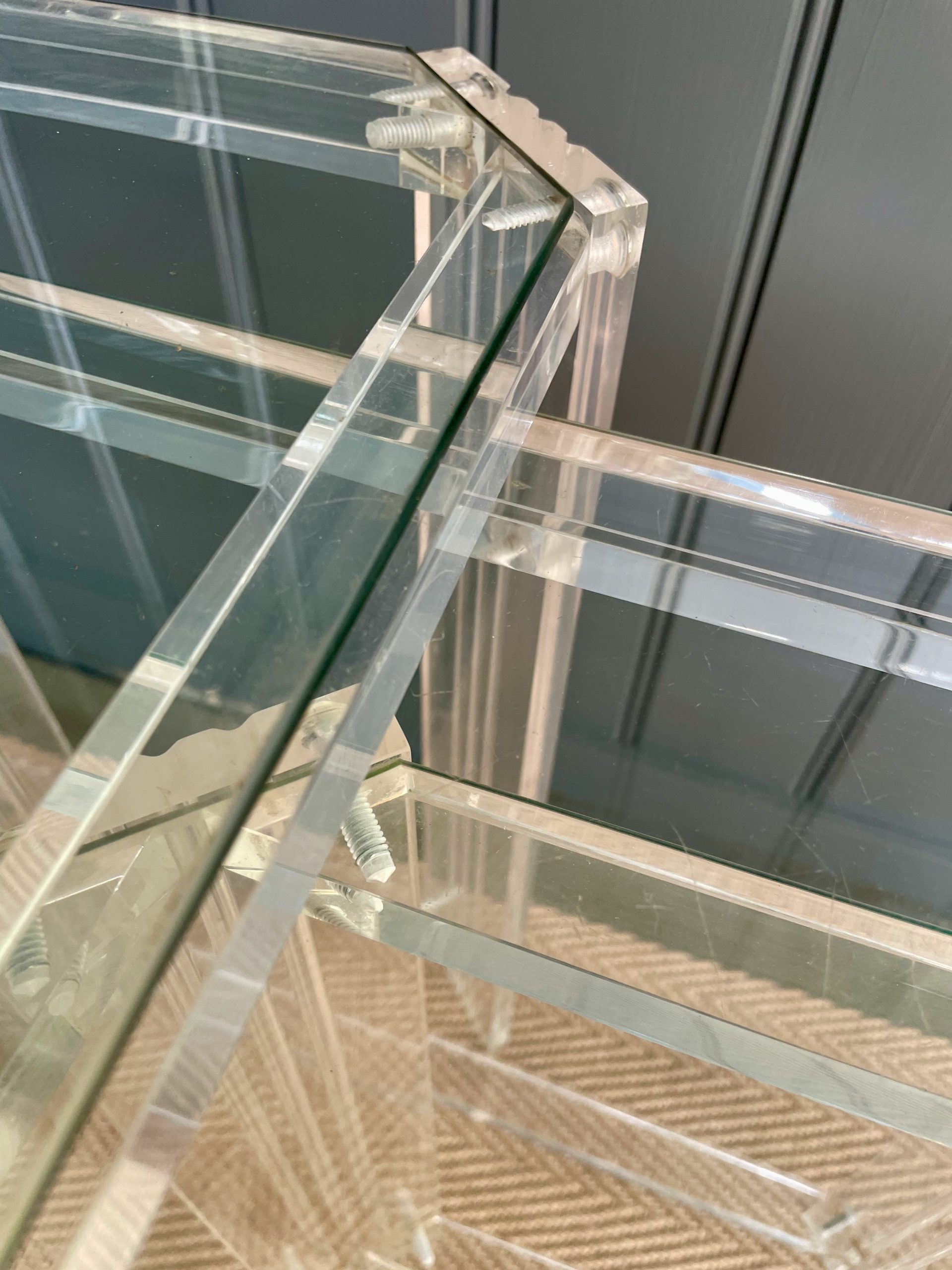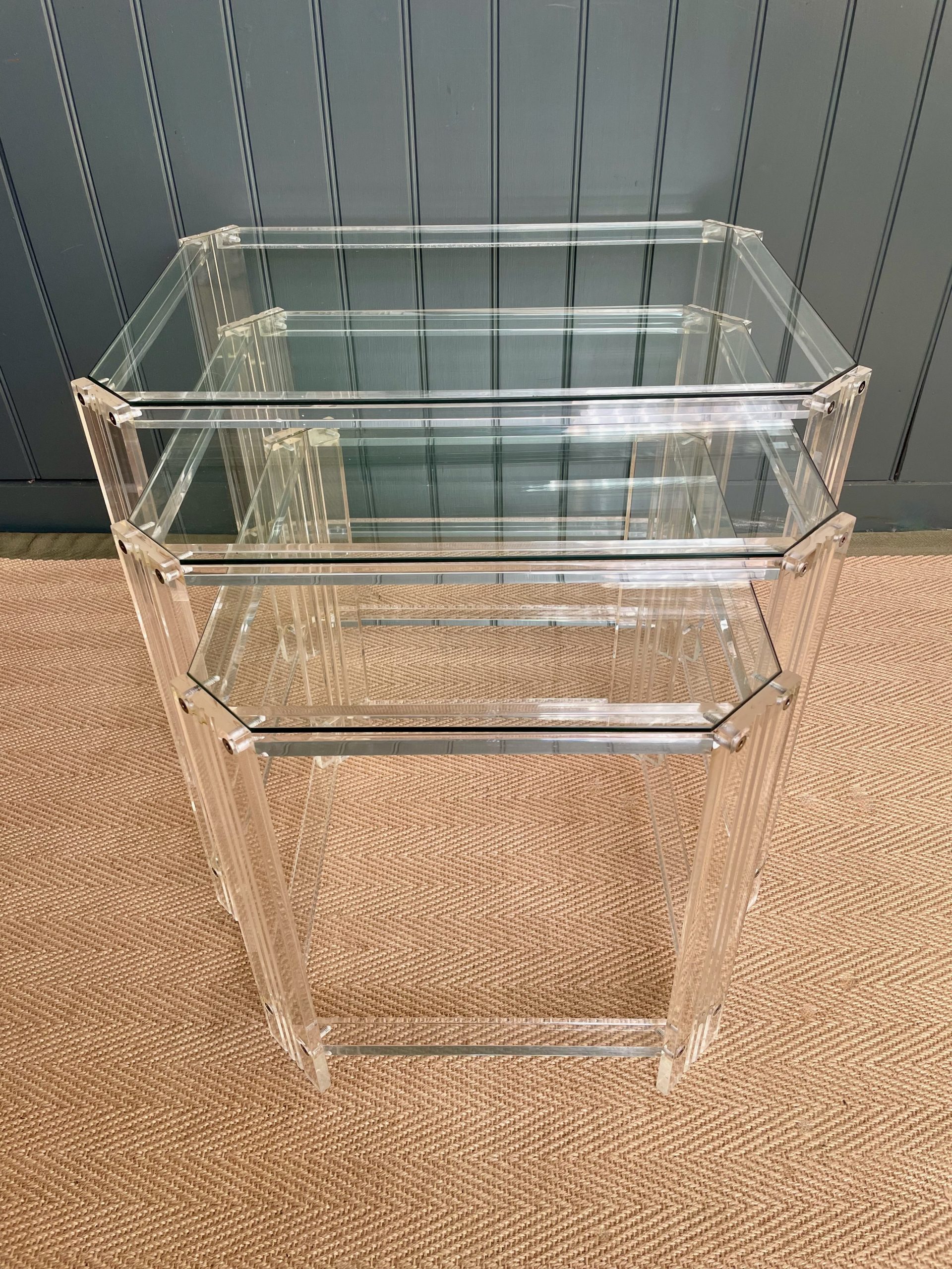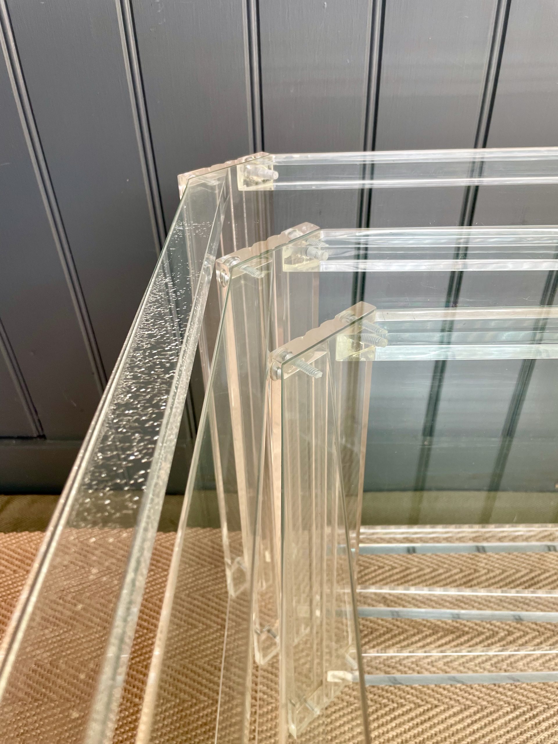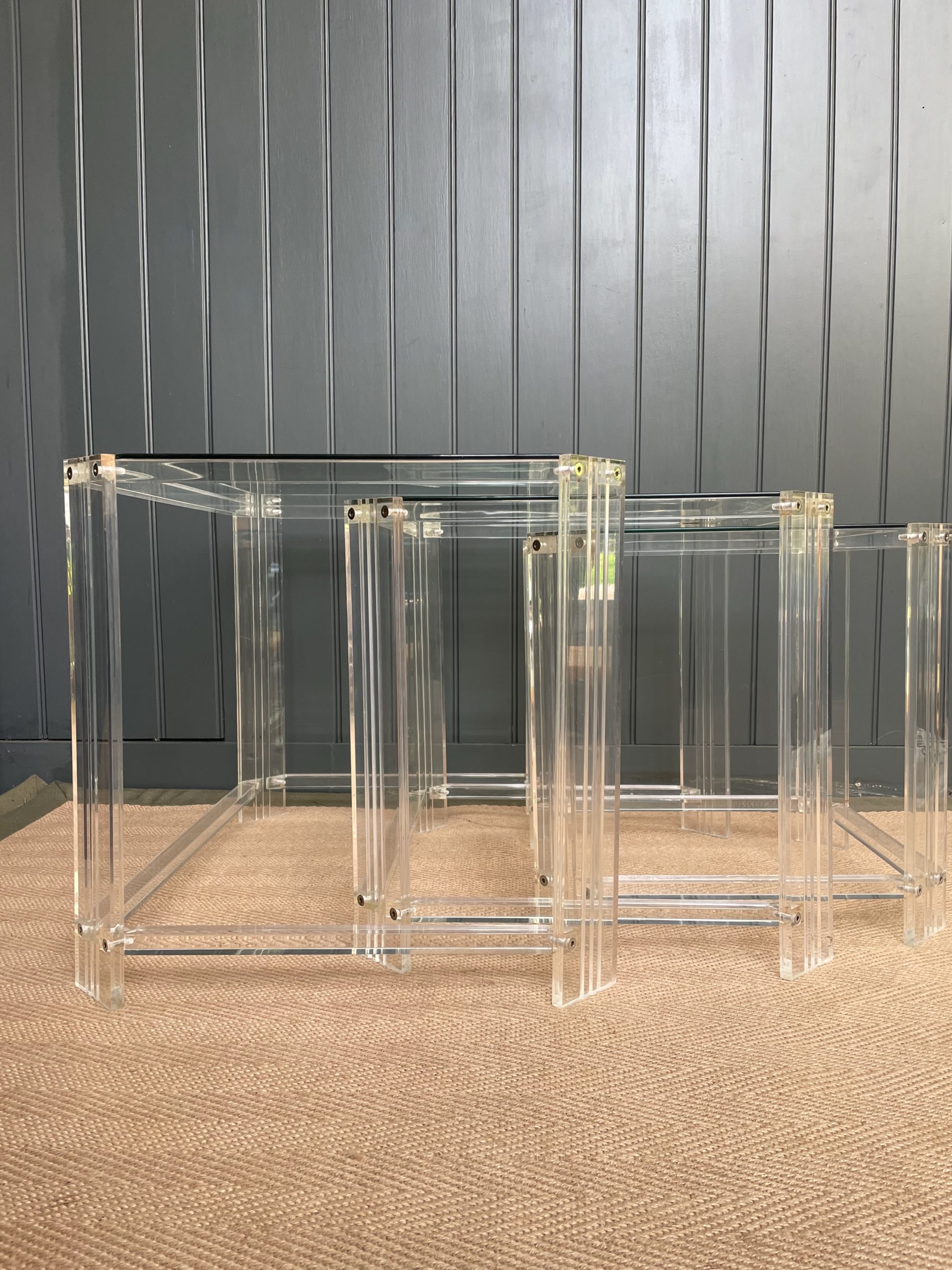 A beautiful trio of French Mid-Century lucite nesting tables, with original glass tops. A lovely design, with faceted corners, and a remarkable transparency, allowing even the thread of the screws to be revealed. Remarkably clean condition, with just the lightest of wear consistent with age. The smallest table is H: 44cm x W: 40cm x D: 43cm. Dimensions below are for the largest.