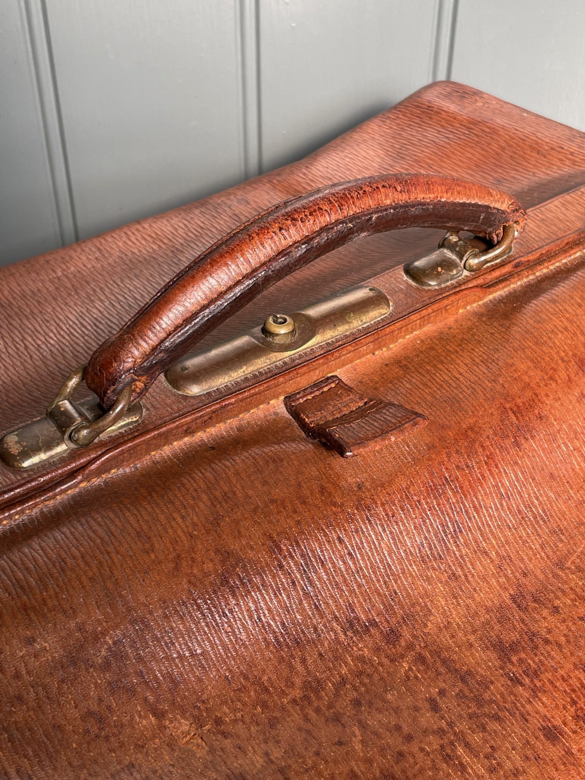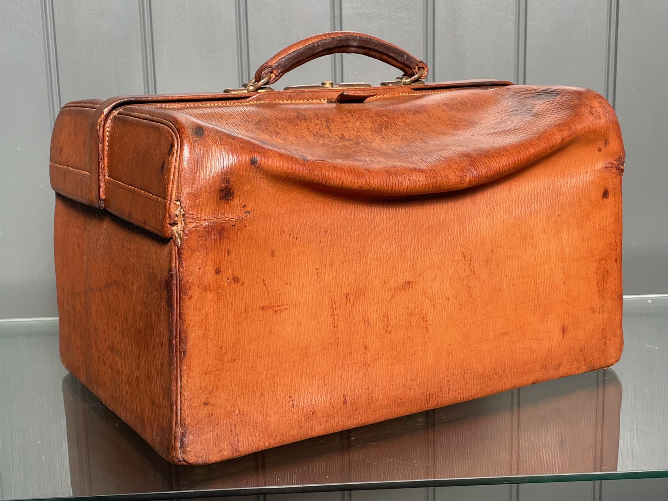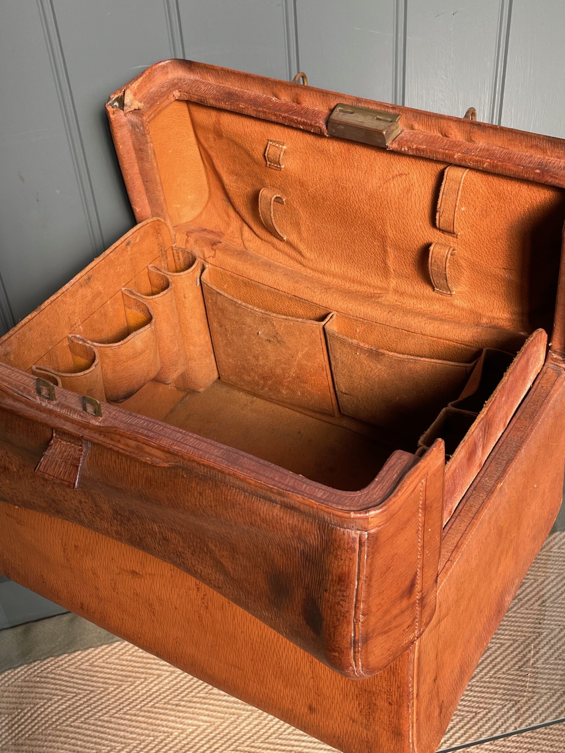 Handsome leather Doctor’s case, with working brass clasp, and an interior fitted out to hold bottles etc. Lovely colour and patination to the leather, with some wear to the corners consistent with age.