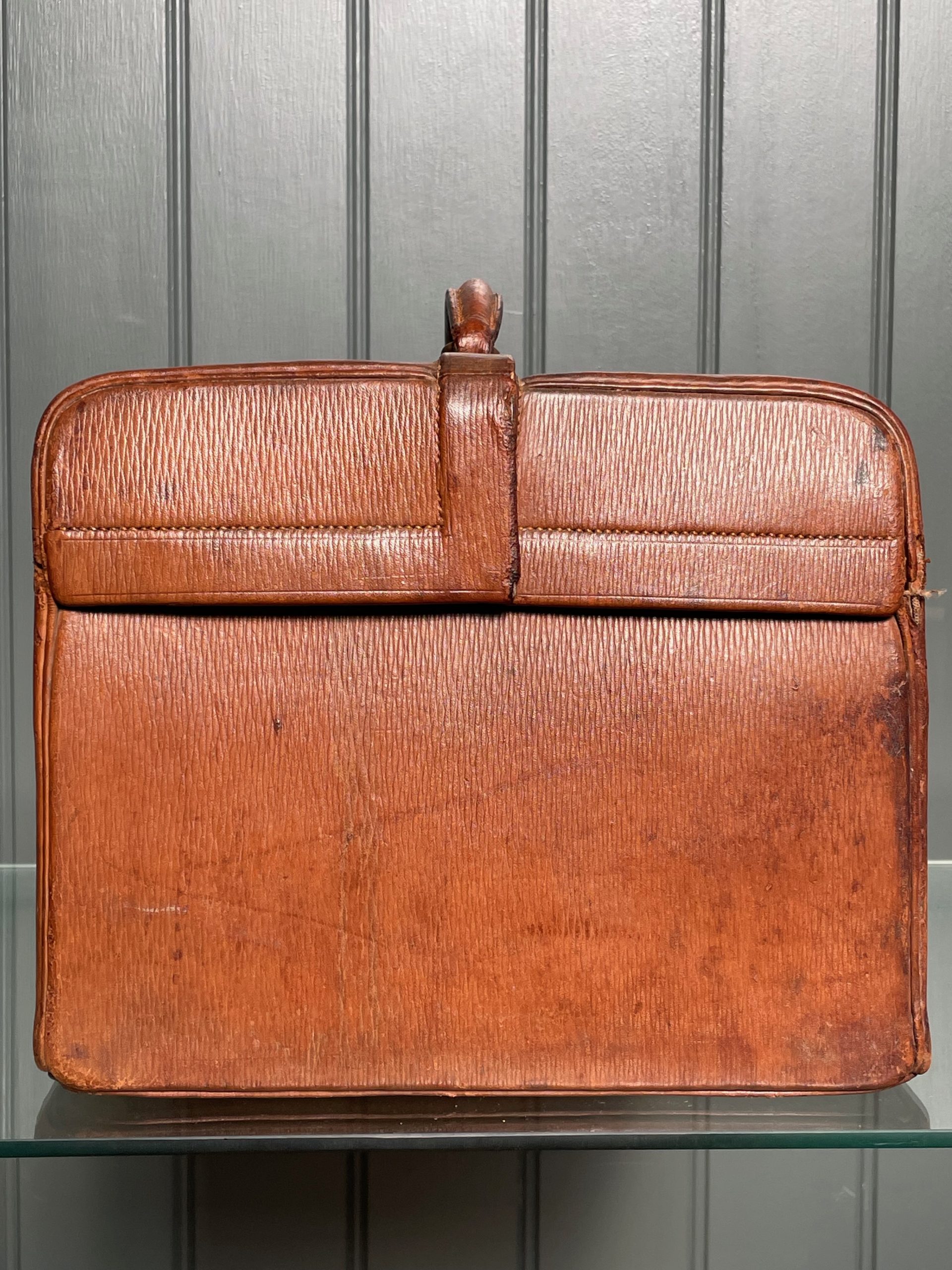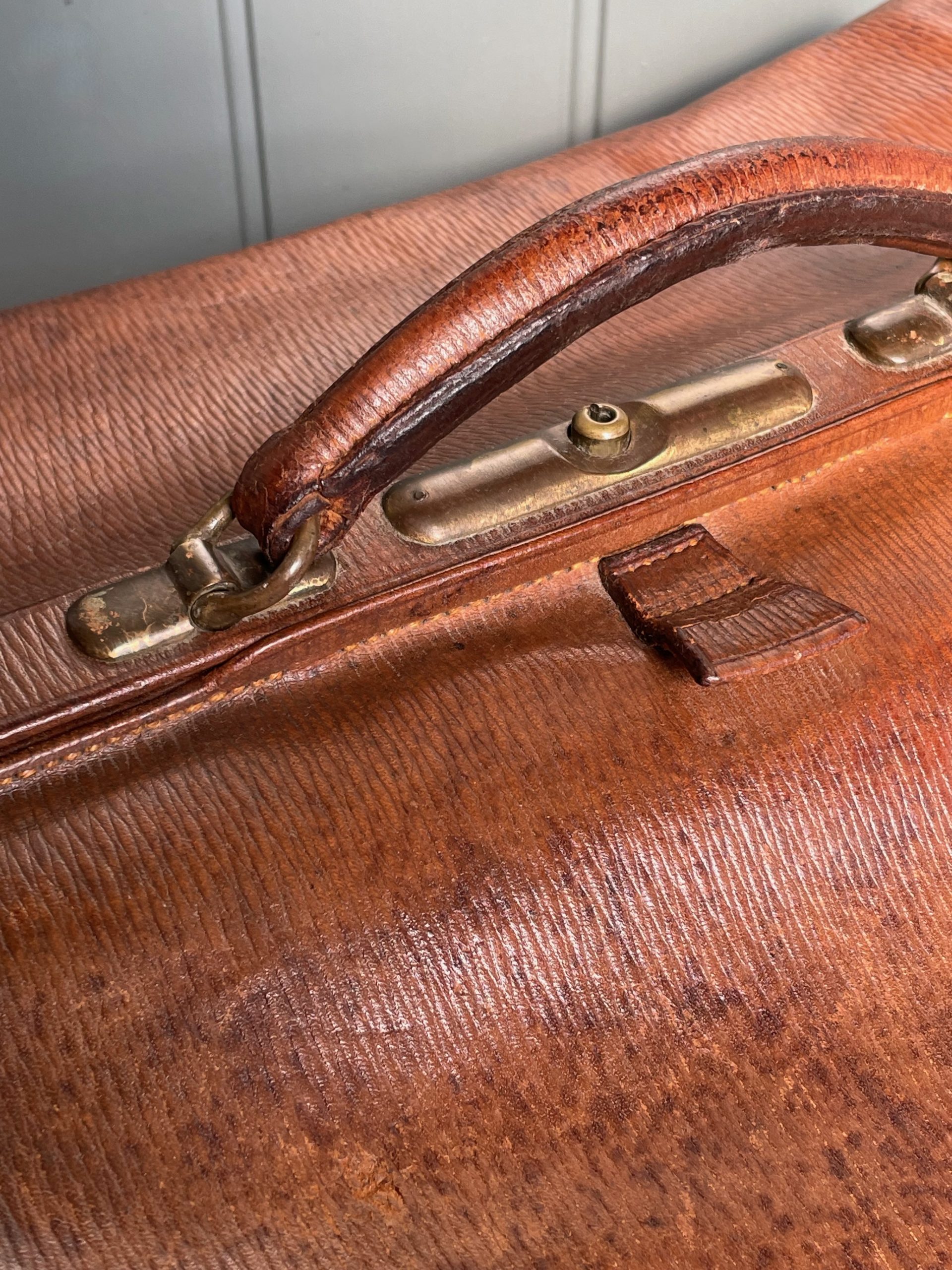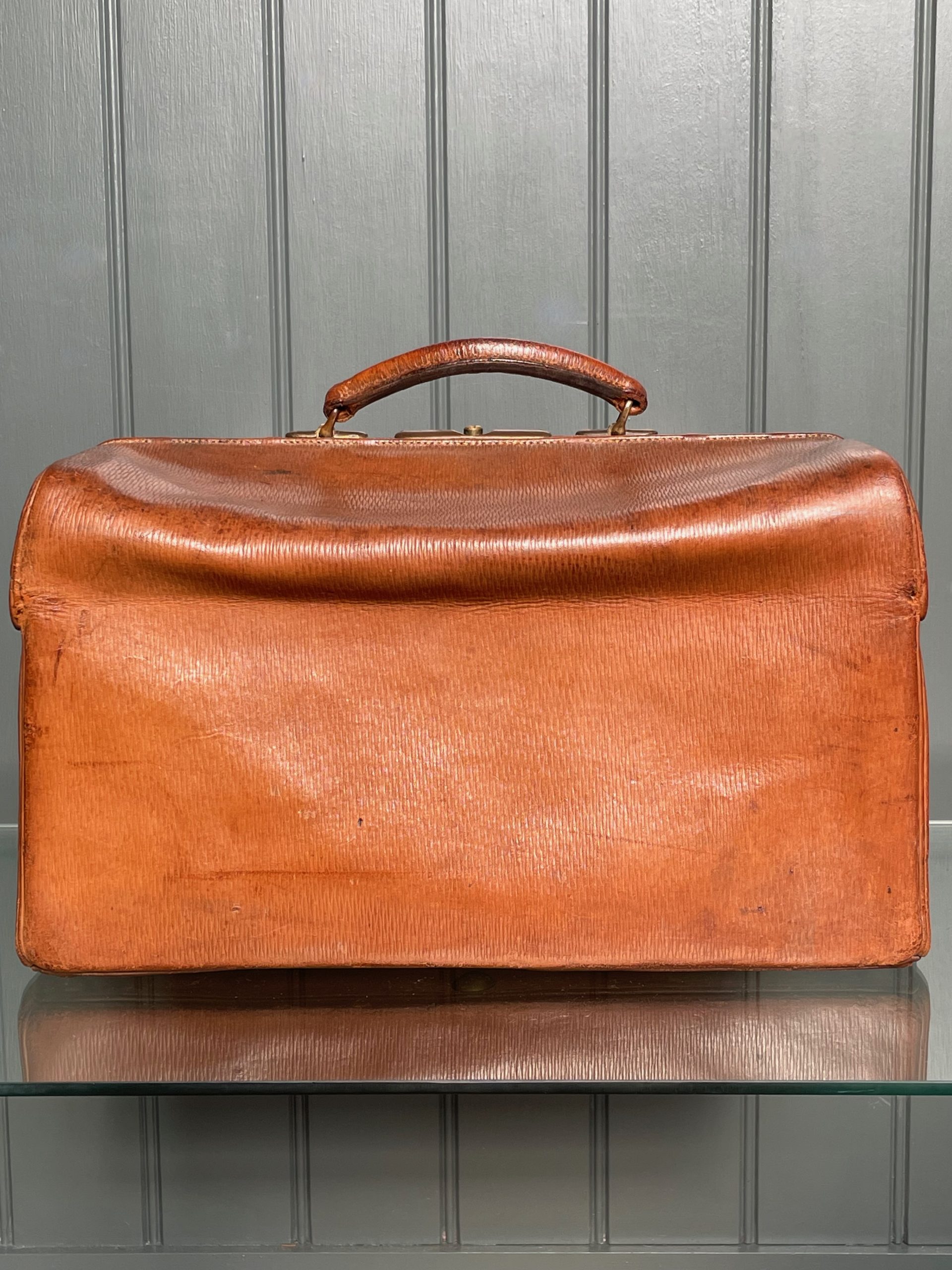 Handsome leather Doctor’s case, with working brass clasp, and an interior fitted out to hold bottles etc. Lovely colour and patination to the leather, with some wear to the corners consistent with age.