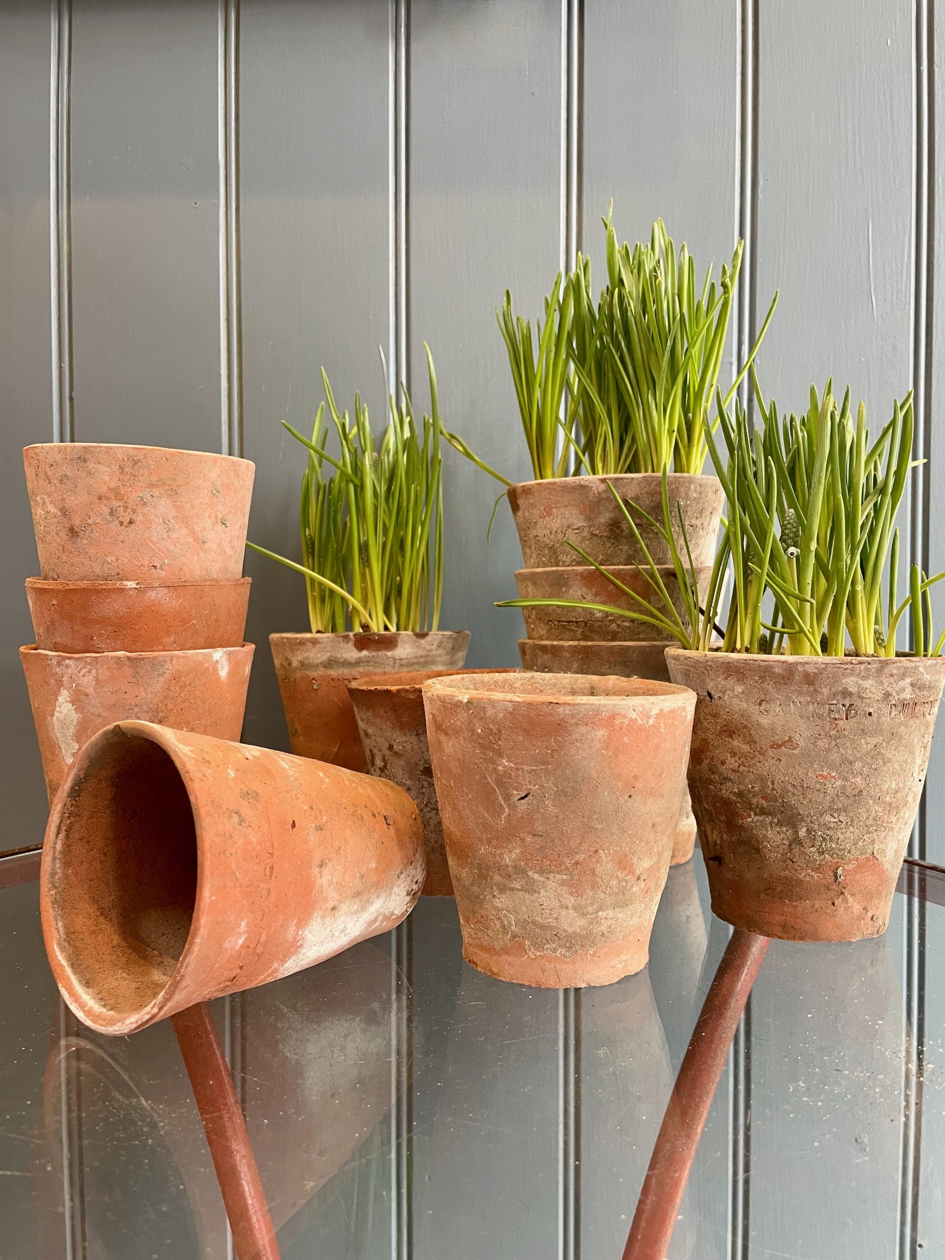 A batch of English vintage small terracotta flower pots, with nice weathering consistent with age, some planted with Spring bulbs of Muscari or Tete a tete. £7 each including bulbs, or £3.50 each for those without.